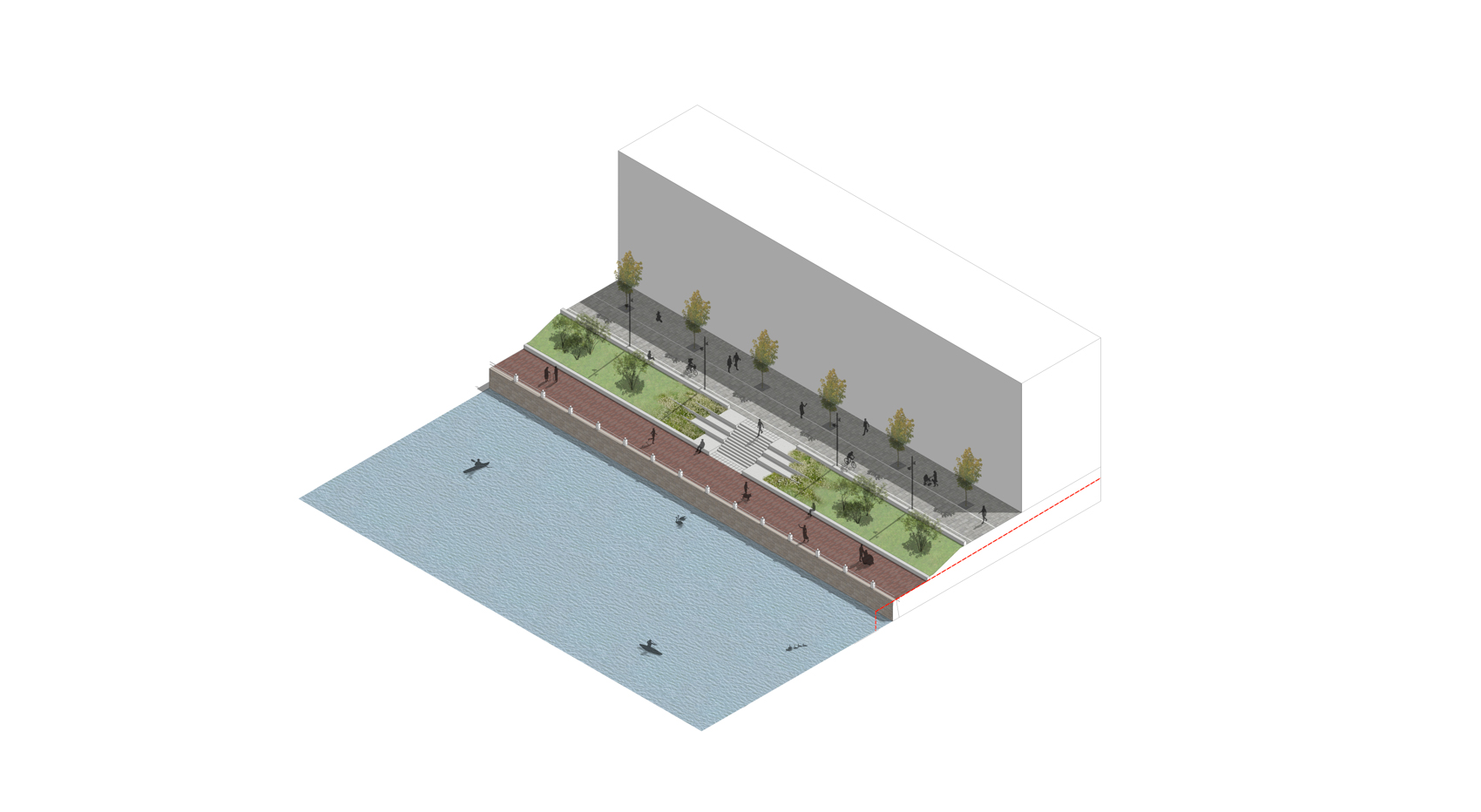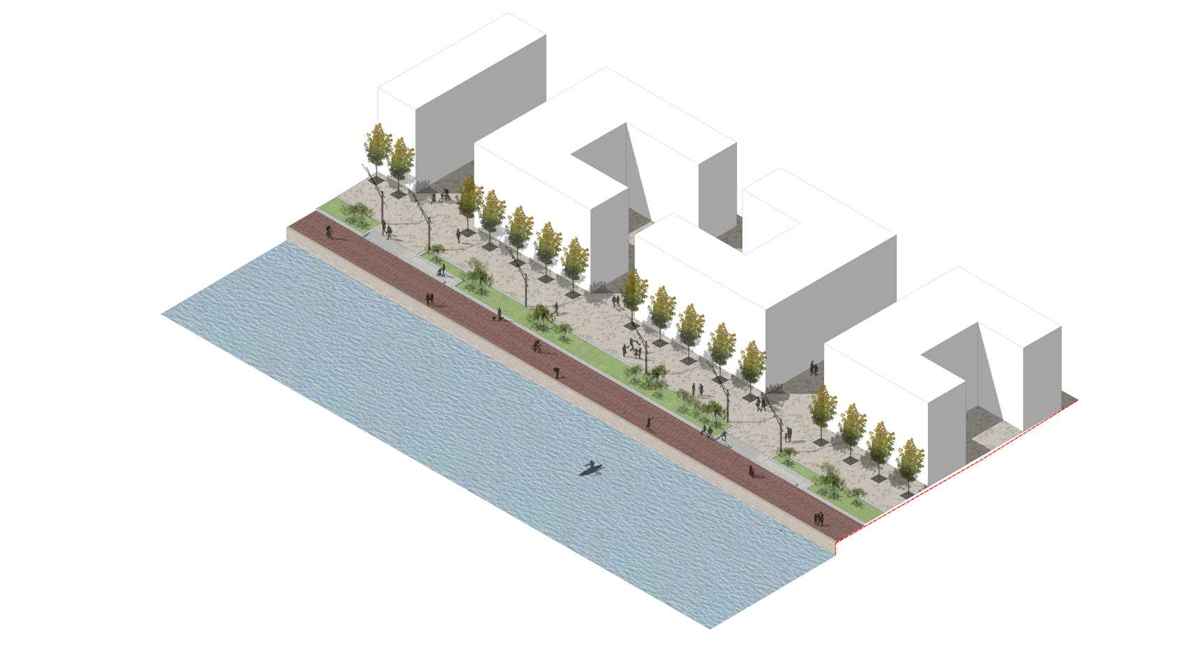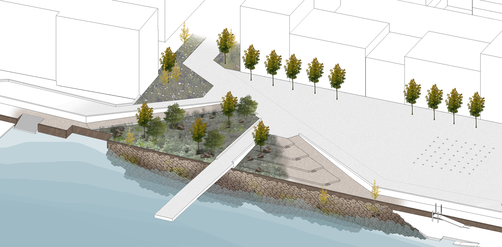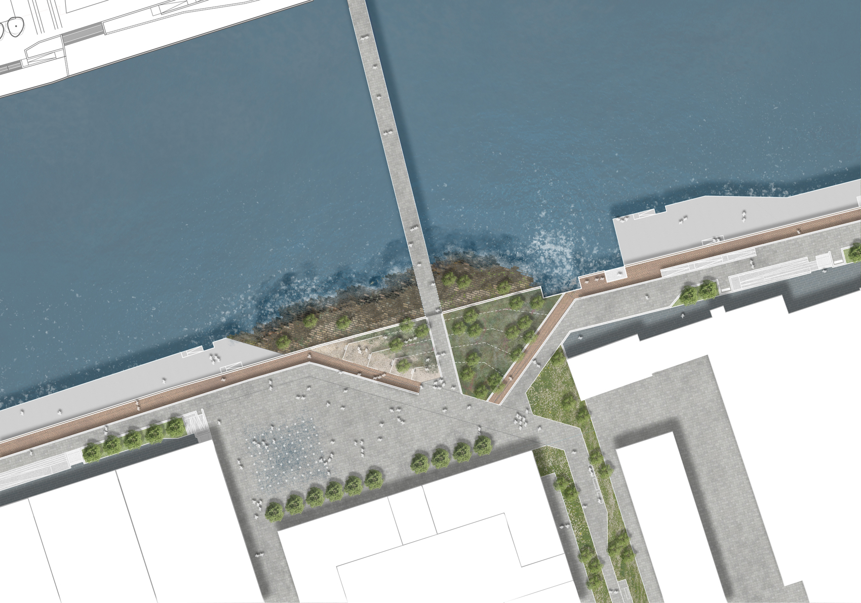The quay combines aspects of heritage, ecology, biodiversity, urban play and health and well-being along its length. A series of plazas, urban parks and ecological features populate the quays and provide access onto the quays from adjacent new streets and developments. The water is to be embraced and improved access into, onto and within the river are considered in our proposals. A number of water edge interventions are proposed such as outdoor swimming opportunities, linear boardwalks, enhanced waterside planting and connections to the Blue Green route with a plaza and cut into the river embankment