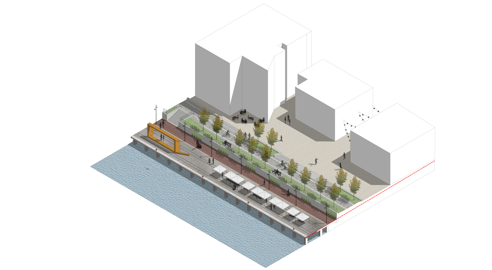 The North Quays offer a great opportunity to provide a setting for new residential development and a waterfront promenade overlooking the River Lee and the South Docks. The new waterfront promenade will bring together the new streets, buildings, parks and active travel routes along the length of the quayside. Providing enhanced access to the water and a transition from new building finished floor levels to the existing quayside level. The proposals put forward a unifying design defining the character of North Quays, providing a consistent interface for the new developments.