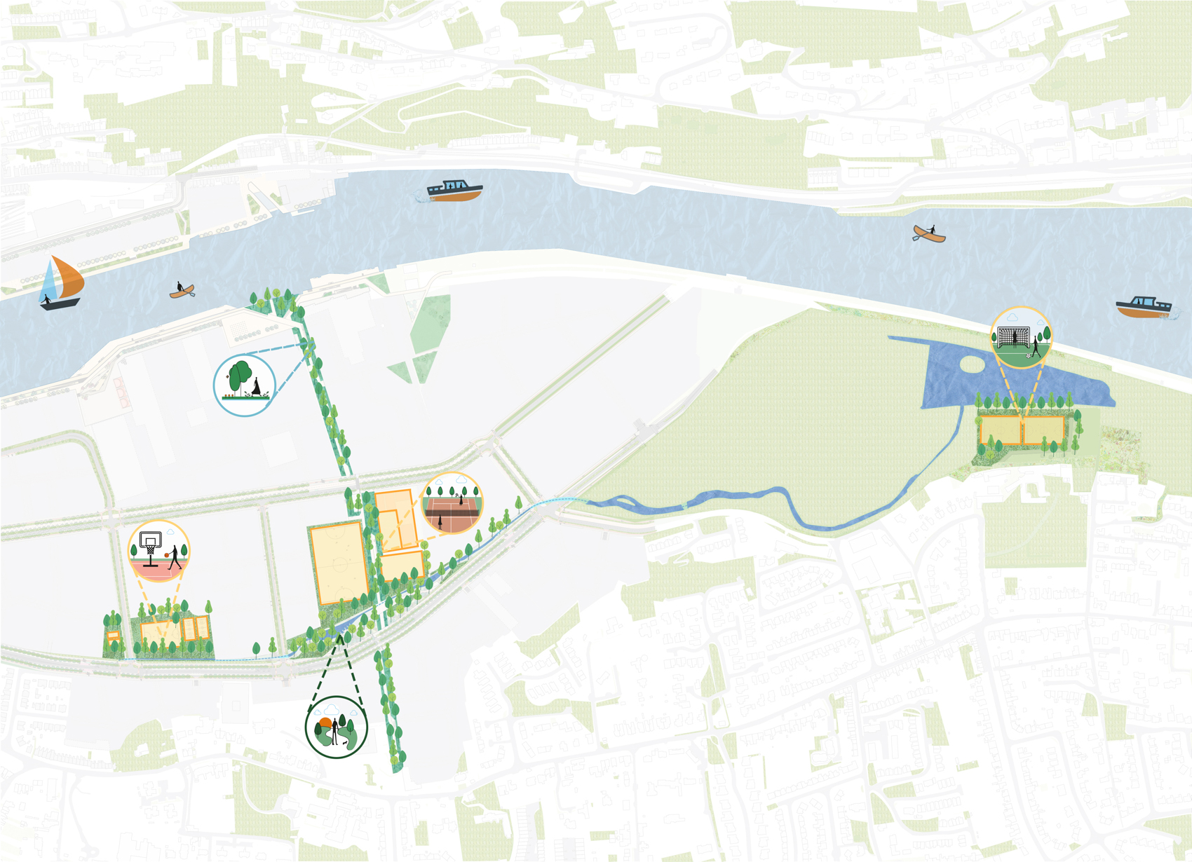 The Framework Masterplan includes several locations for active recreation infrastructure, including formal facilities such as playing pitches and sport centres and informal facilities, nested within public realm and landscape spaces. Informal play interventions are also incorporated into the landscape, encouraging exploration and activity for a range of ages.