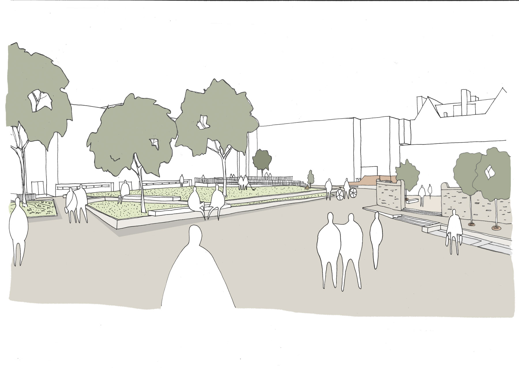 A study of the historical layout revealed that this space used to be populated with a series of stores and outside rooms along the alignment of the original historic wall. The design proposal was to superimpose this layer of history on to the new paving. Granite setts were designed to be treated using a variety of finishing techniques such as bush hammering, chiselling, flaming, and honing to create distinct colour changes that define the walls and rooms in 2D. The position of the former boundary wall is represented by graphic concrete banding.