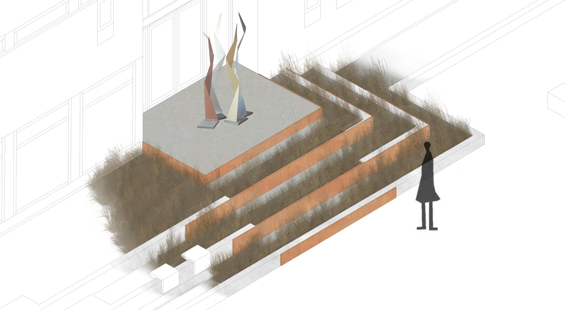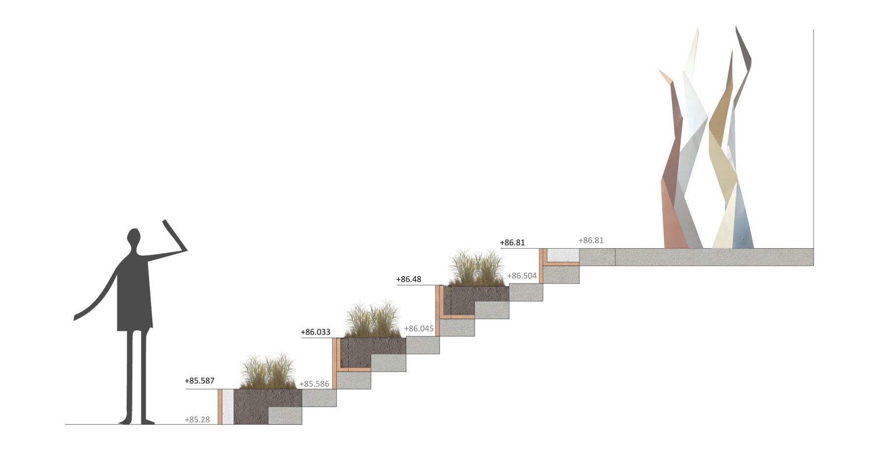 The landscape proposals have been designed to respond to the architectural detailing of the façade as well as the careful integration of the existing steps (to be retained as a heritage asset). The design intent is that the landscape will rise up to engage with the full extent of the new building openings to create a series of partially inhabited planted terraces that soften the heaviness of the building plinth. The raised terraces will provide informal seating edges with the positioning of the single seats and loungers relating to the new elevation and window details.