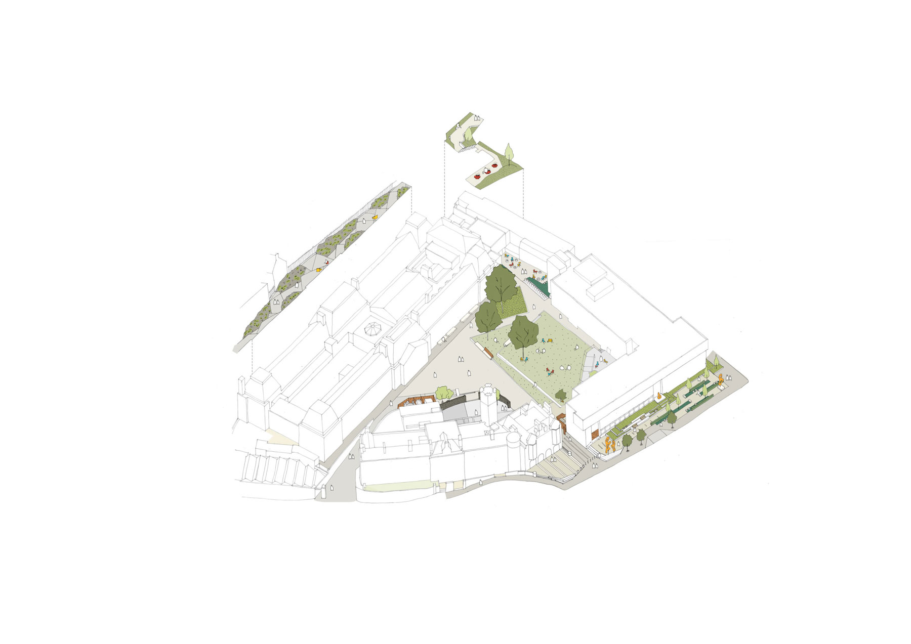 The campus courtyard and external amenity spaces are underutilised and there is a strong desire to design out the challenging existing delivery and traffic management practices. The outdoor spaces are dominated by parking and a mismatch of low quality materials which do not reflect the outstanding historic building asset. The landscape plays a crucial role in uniting the campus of buildings as well as giving it more presence in it’s urban context. As well as being the social heart of the campus, it should be a space for learning, teaching with a choreographed events programme, for its staff, students, and visitors.