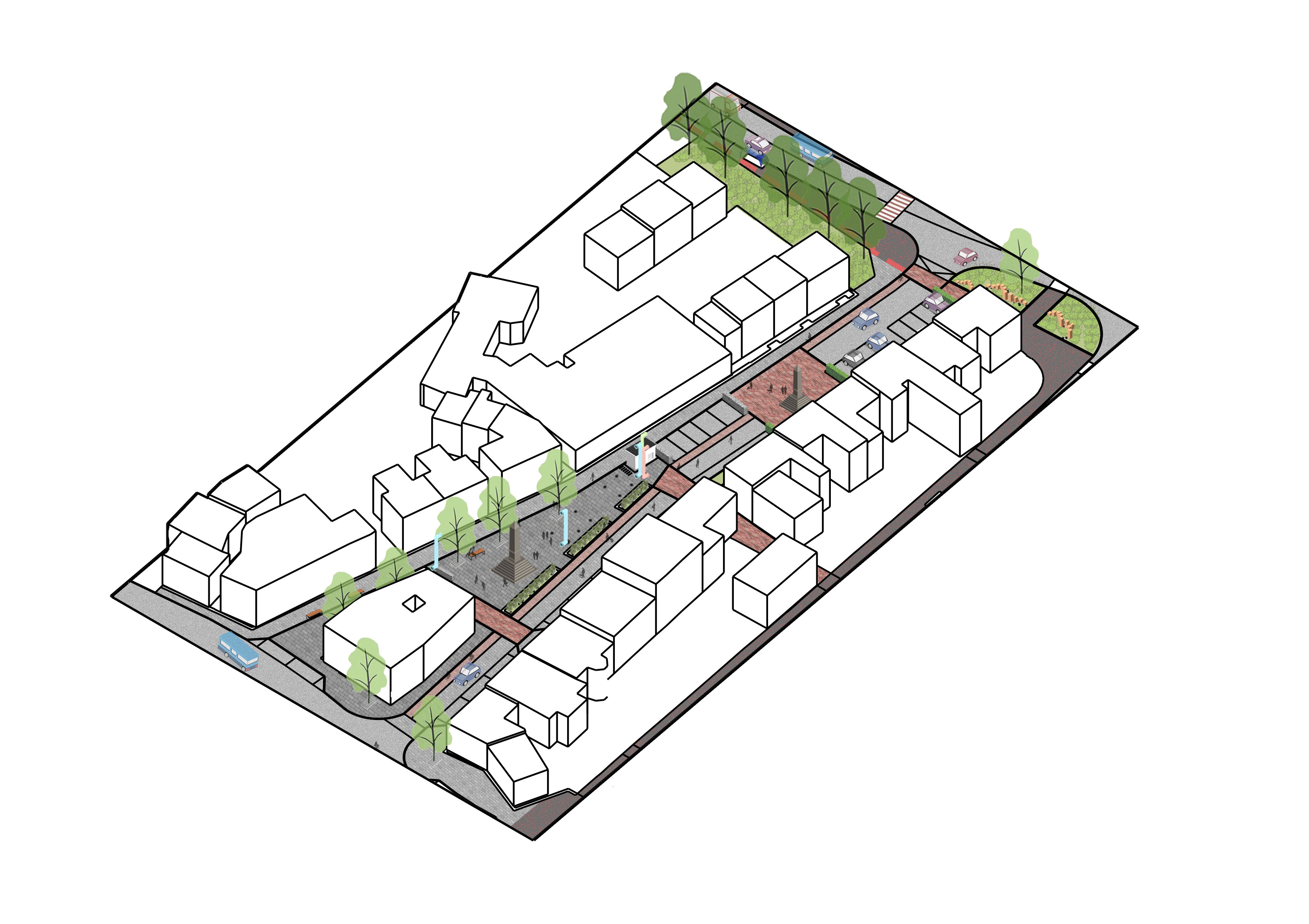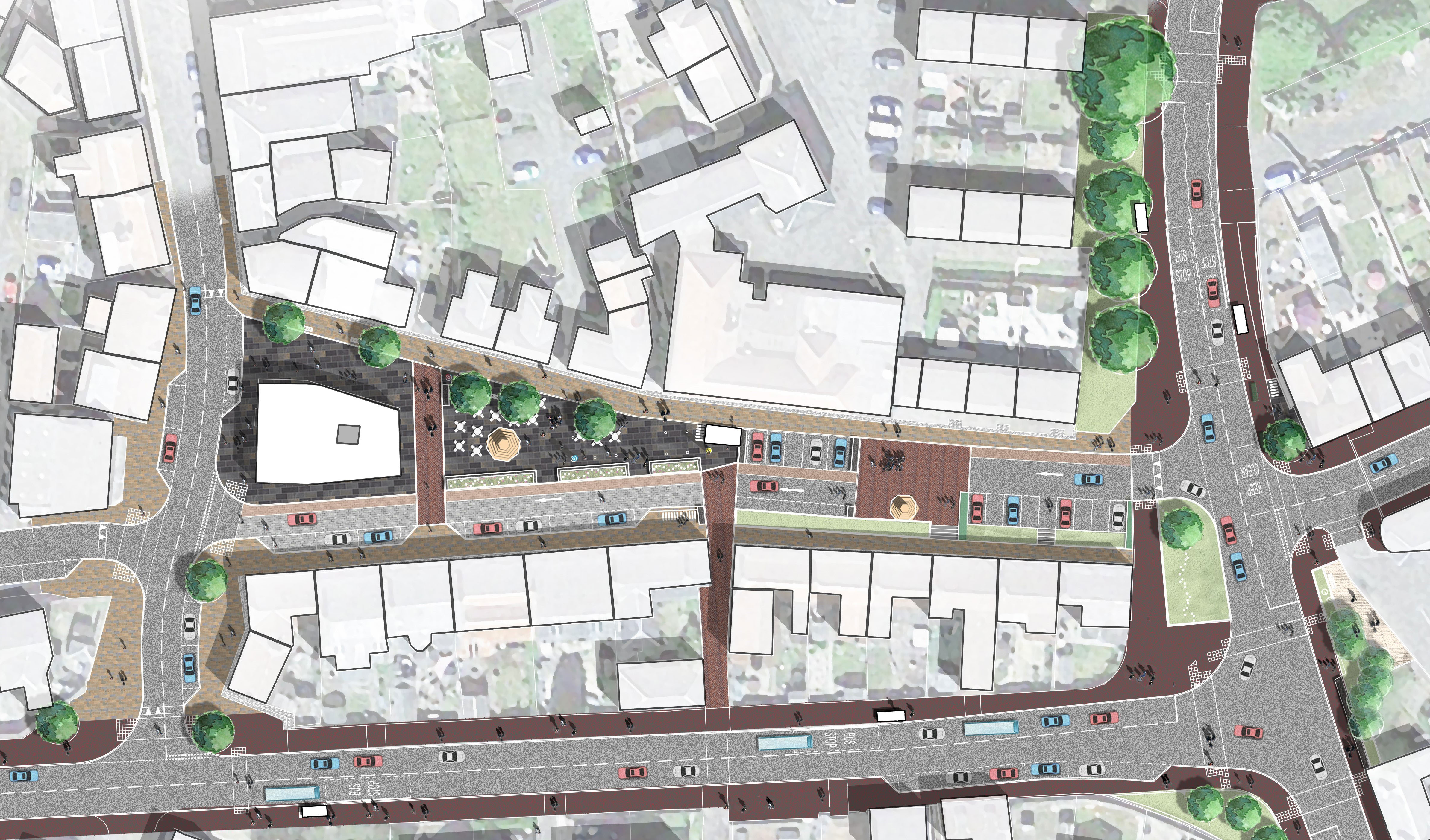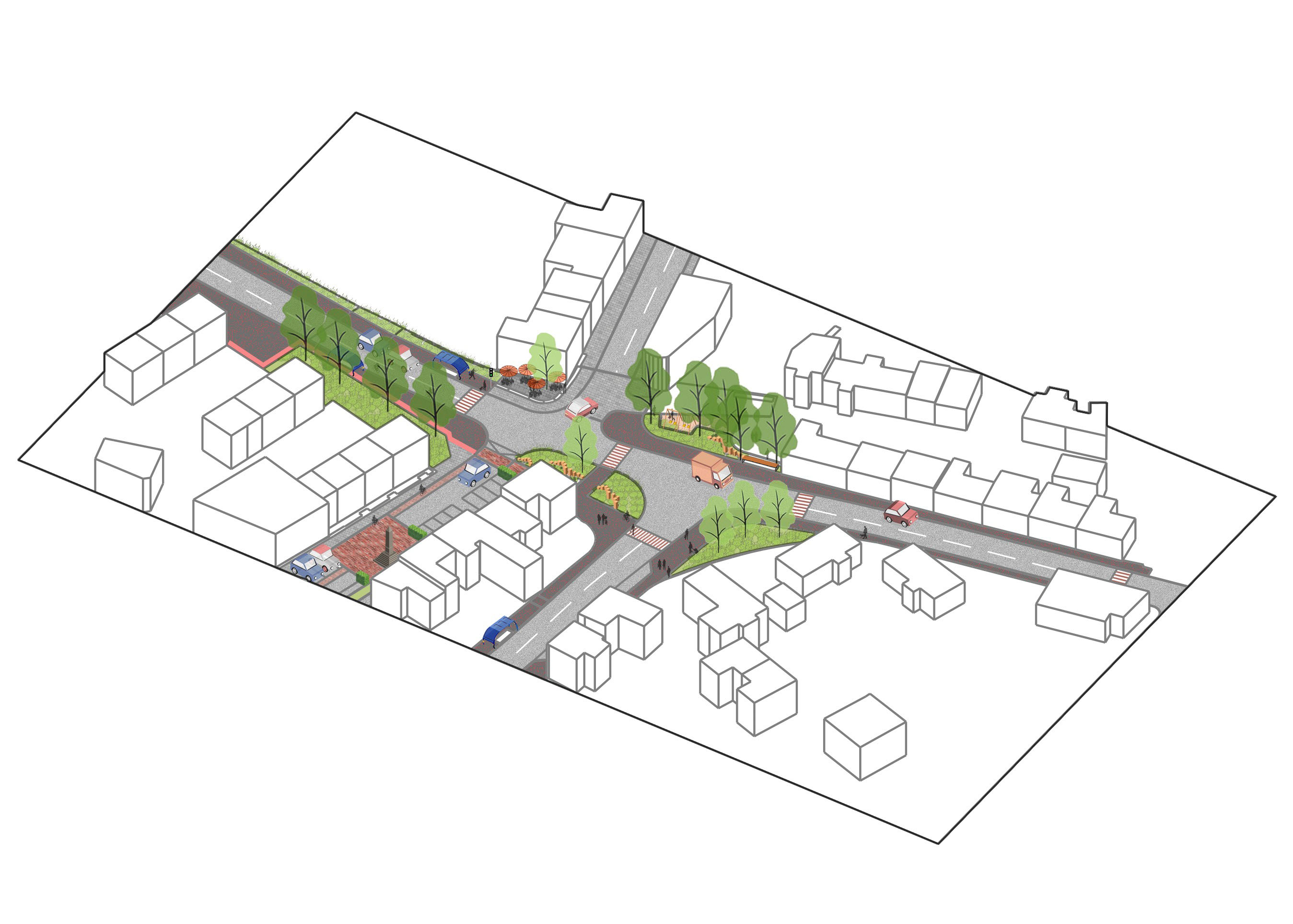 To maximise the environmental improvements and use of the High Street, it is proposed that several design solutions are implemented, these respond to best practice in Landscape Architecture. Including a multi-functional and flexible people space at the heart of the community.