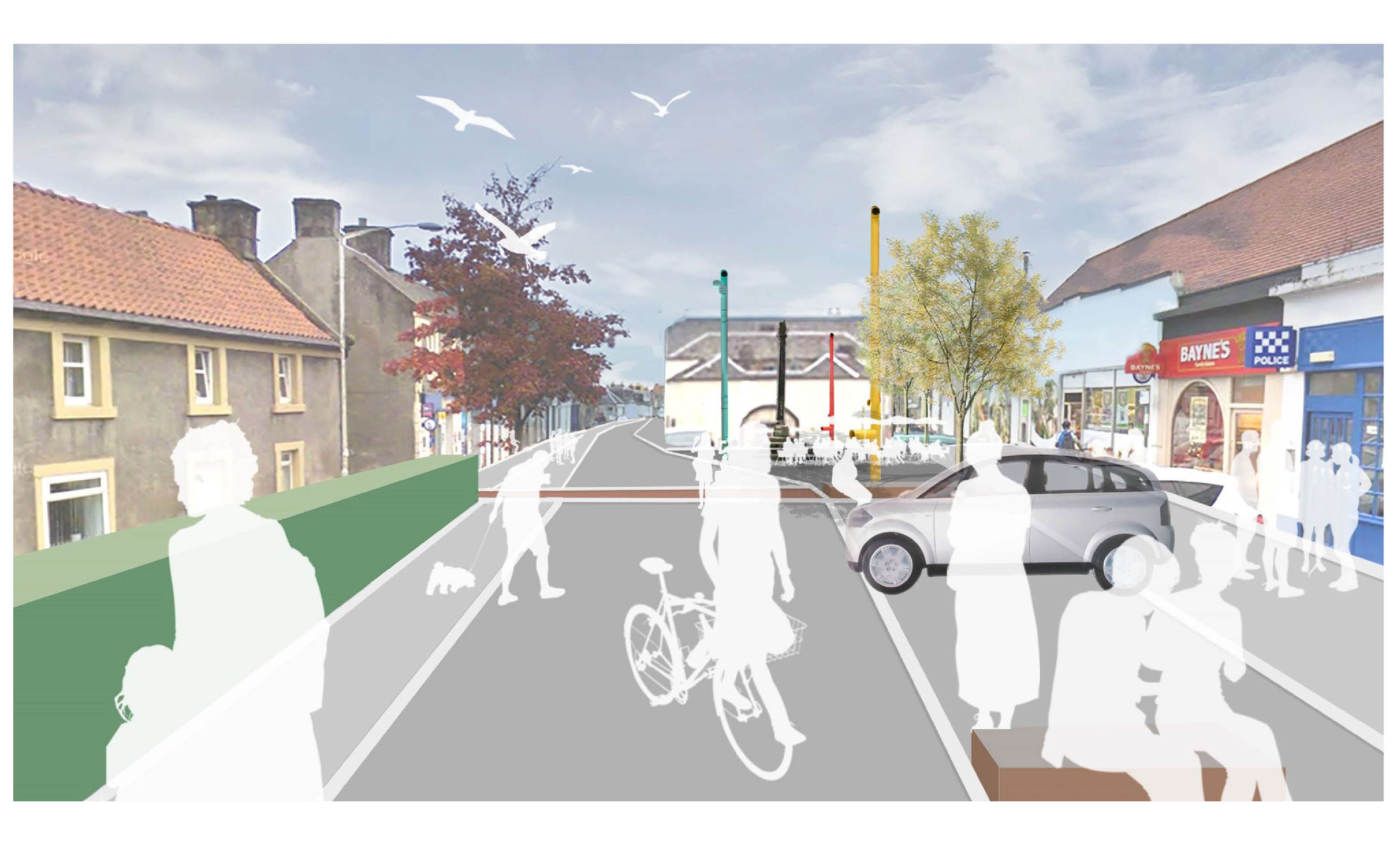 Kincardine has a strong sense of community and a very industrious past. Residents have been part of the project from the start and helped shape the design in the concept stages. The scheme has a people-first approach to design, creating safe, attractive, and engaging spaces in the heart of the town. A revitalised and sustainable high street for everyone elderly and young will benefit from the changes to the high street providing safe routes for bicycles and a place to meet friends without heavy traffic or buses. This is a project led by the community from the early ideas from the Charrette, it is for the betterment of the community. Reducing clutter as part of the project and creating areas of seating and bike parking to make it a more welcoming environment for active travel users. Introducing trees and rain gardens into the street scape will enhance the environment of the High Street. Upgrading and introducing new active travel routes branching off from the junction so it is well connected to the surrounding network. Refining the road layout around the High Street and the junction to better balance facilities for both vehicles and active travel users, and pedestrians to safer cross the road. Local businesses have been engaged in the proposals to ensure that there is wholesale support for the improvements. I large vacant unit in the centre of the High Street is currently under review to become a vibrant community café, indoor market, play and workspace facility. Redefining vacant units on the high street is vital to support the town and increase the diversity and vibrancy of the place. The community is optimistic about the potential for changes and improvements within the village. Throughout several community engagements and design workshops over the past few years, the design has evolved to accommodate their desires whilst complying with best practices in design and statutory guidance from Fife Council and Transport Scotland. |