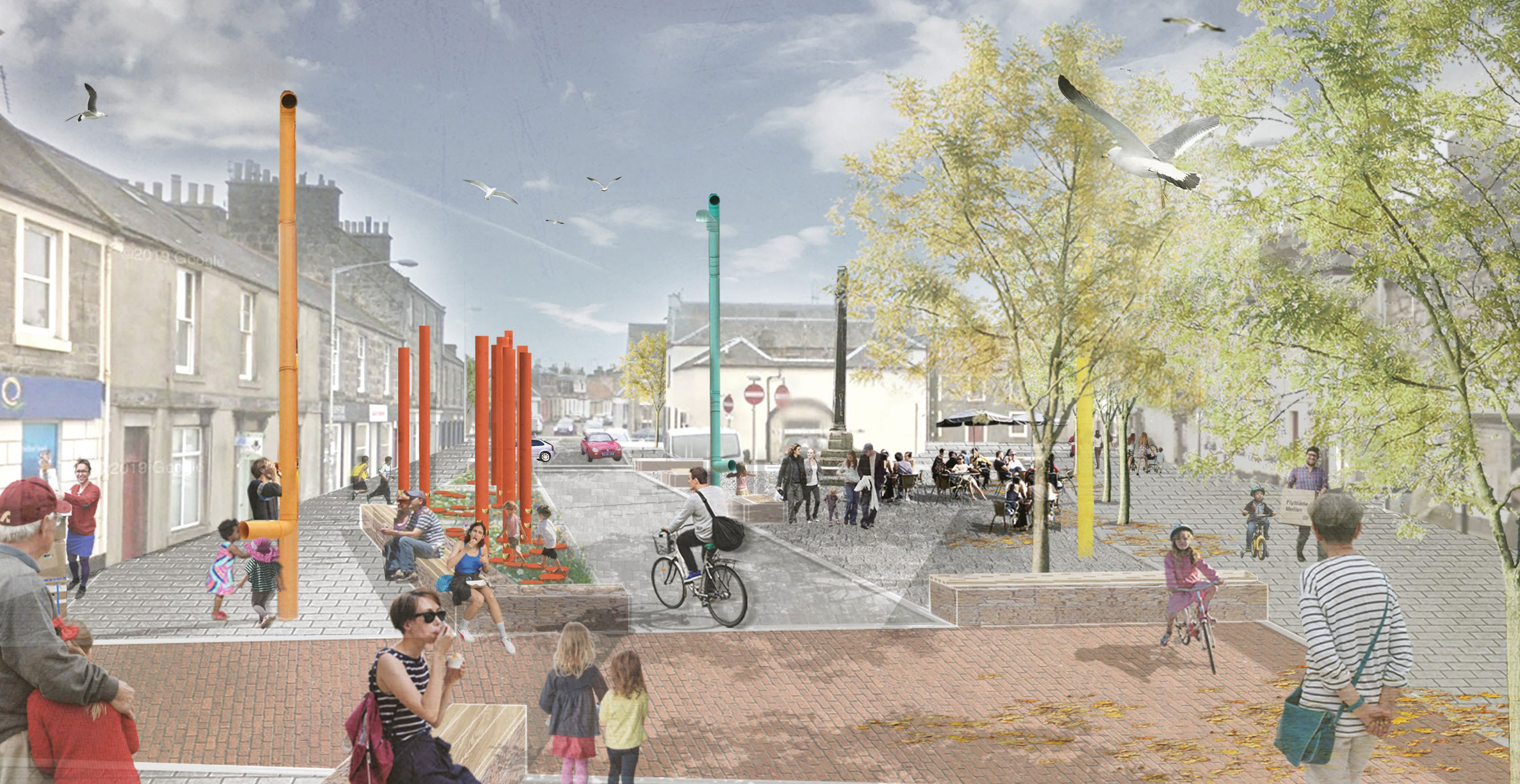 To activate the high street and encourage people to stay longer, we have introduced an element of play to the landscape. These play structures are inspired by Kincardine’s history, with the structures inspired by the industrial past, chimneys of Longannet, and the town's fishing heritage. These play structures will be multifunctional, also offering lighting, charging points, posts for market stall canopies, and periscopes.