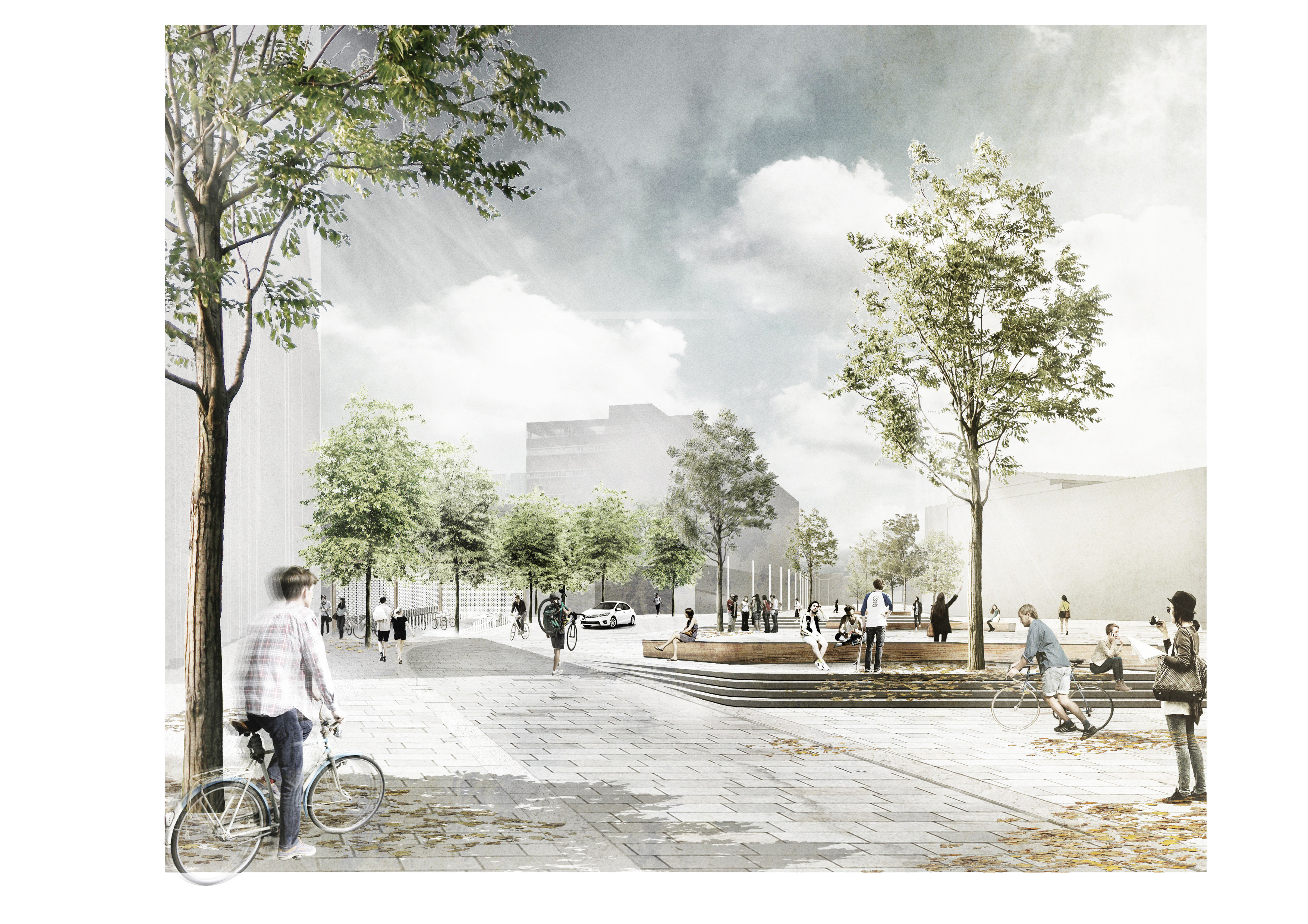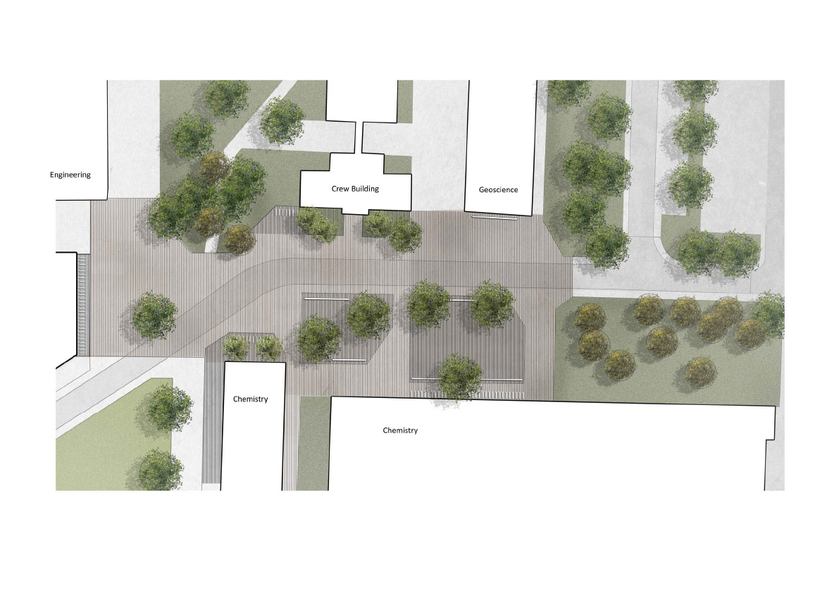 The Plazas serves as a main access route to Kings Building Campus and will function as a civic gathering space as well as an entrance point to the School of Biological Sciences and Geoscience. The focus has been to create a vibrant and lively plaza. To achieve this we imagine arranging the main square as a small amphitheatre, whereby the centre is kept clear of clutter and the edges are populated by the seating elements which could suitably host an audience. In a similar manner to a theatre, where individuals can perform to spectators, as well as other events and activities. The surface of this space is constructed of high quality natural stone that has a subtle change in tone and pattern to delineate the space from the overall scheme.