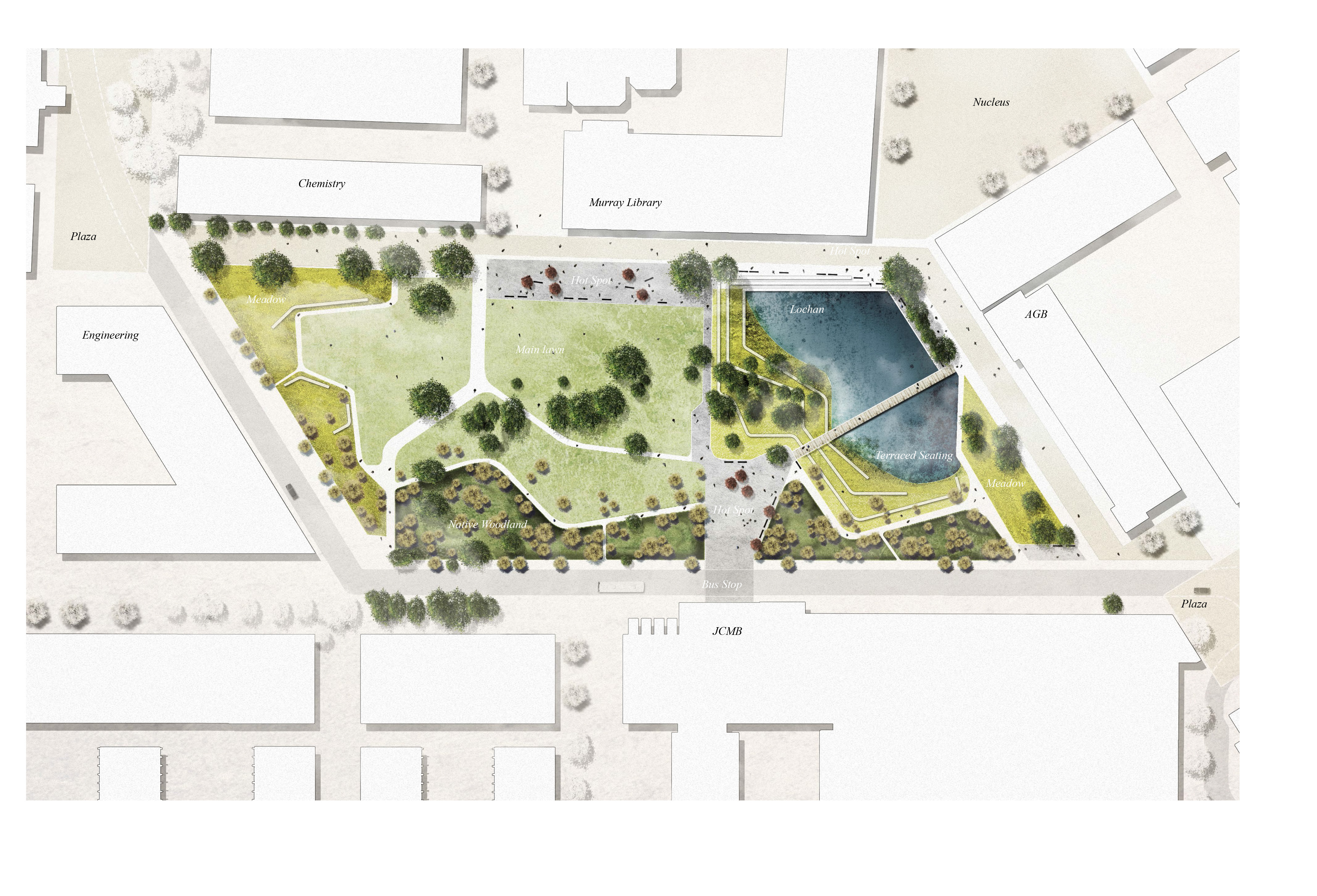 The Central Green is a symbolically democratic space representative of a shared amenity between all schools on the campus. In the future, it will create an iconic setting to the campus. Through combining precise framework design and flexible open space the Central green will accommodate the diverse range of users at King’s buildings Campus as well as significantly improve its biodiversity. The design draws on inspiration from the surrounding context and the existing landscape features. The spatial assembly is fundamentally simple and legible, yet allows much to occur.