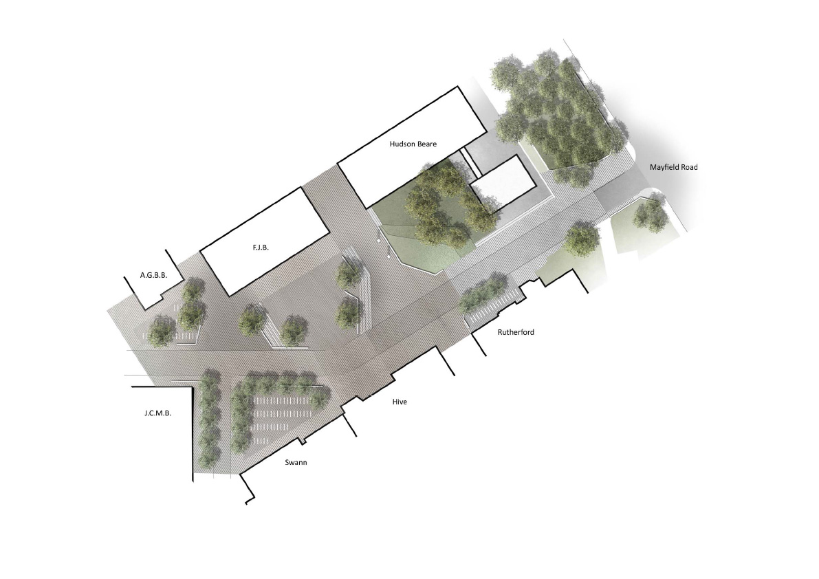 Networks are formulated from the movement analysis of the plaza and work with the topography to connect the plaza to routes around the campus. This includes a clearly defined road from the Mayfield entrance that will safely accommodate vehicular traffic, bicycles and pedestrians within an inviting Plaza environment. Different surface materials will relate to the wider links around the campus or act to define and express different spatial qualities.