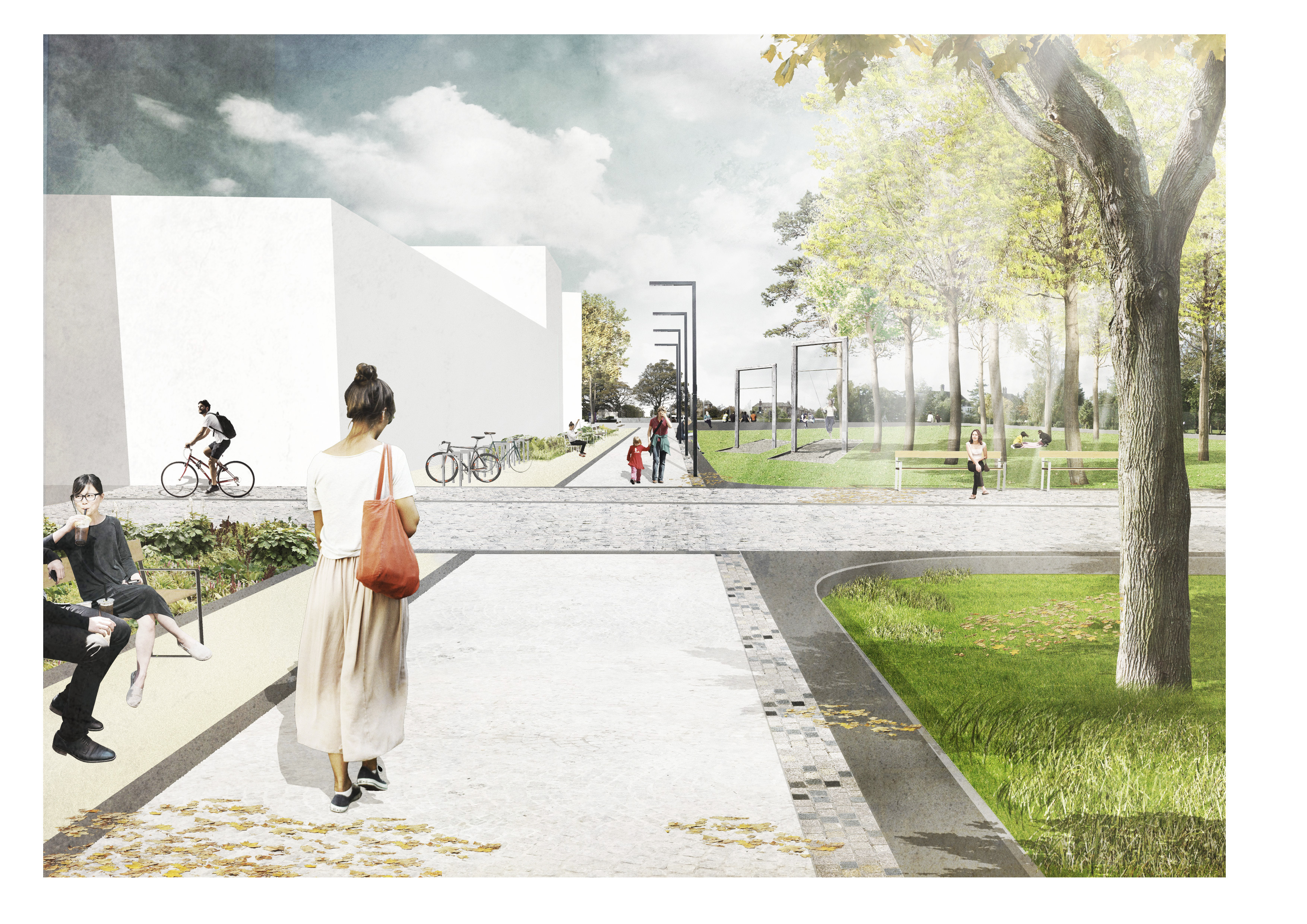 The southern perimeter route is predominately pedestrian. The look and feel of the street will integrate with the park character of the central Green. It will function as a road to serve buses, taxis and visitor drop off, with access controlled at the two book end plazas.