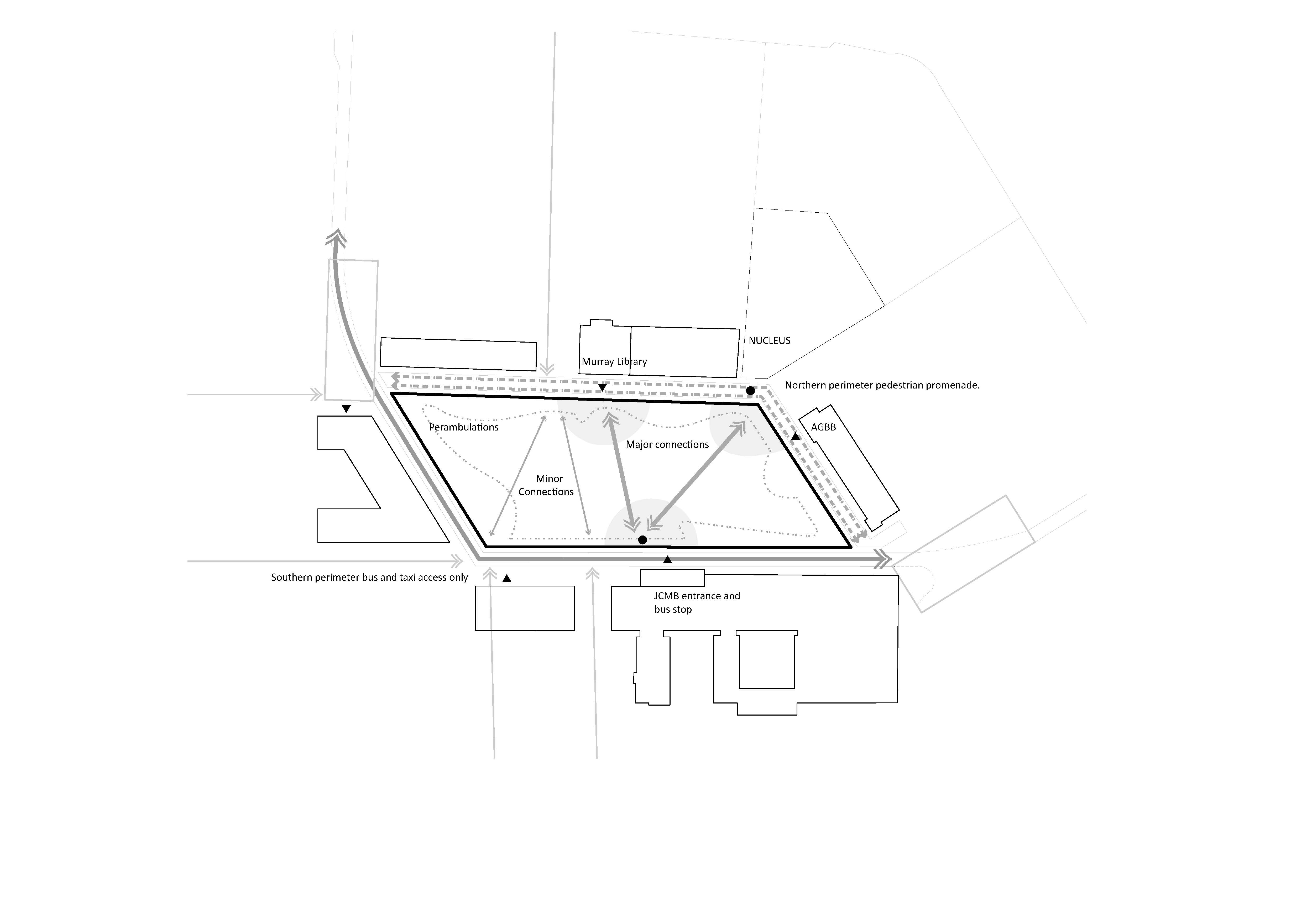 The three major ‘hot spots’ of activity in the Central Green will be catalysed by proximity to the Nucleus, Murray Library and JCMB Bus stop These ‘hot spots’ form a triangle of major routes traversing the Central green. This is the basis of a core structuring device to the site framework. This network will frame the focal water body that will accommodate a large proportion of the sites SUDS provision.