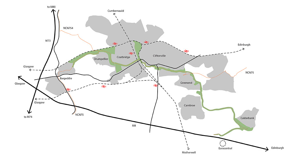 The Monkland canal corridor exists as open water, built urban form or as unused overgrown open space through a forgotten and redundant landscape, stretching from Euro Central in the east to Easterhouse in the West. The Monkland Canal is the fifth canal in Scotland and runs through a number of North Lanarkshire communities including the town of Coatbridge.
