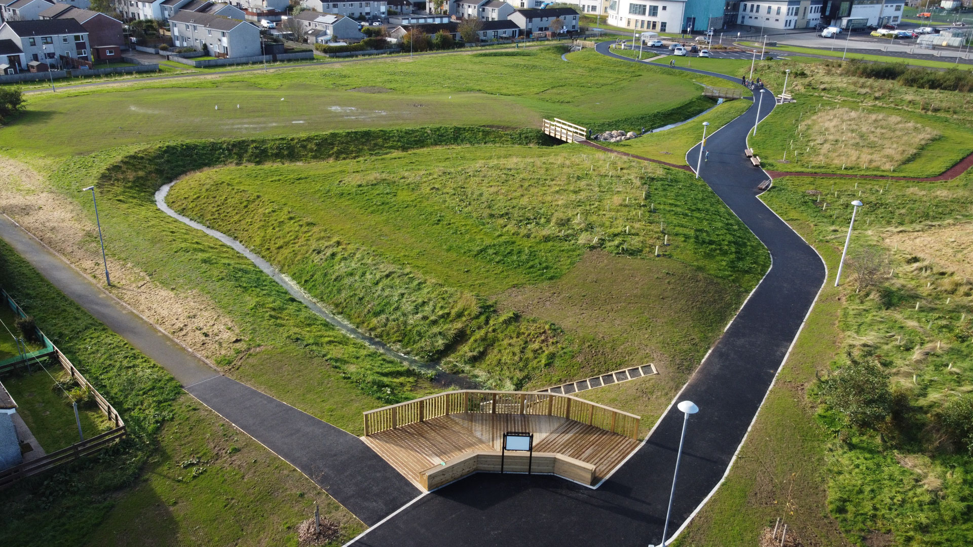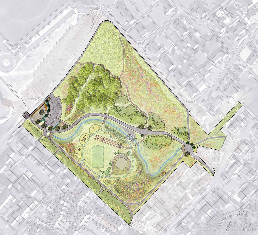 The design proposal rationalises and simplifies the layout of the paths across the site. Having one key direct route through allows for visitors and locals to engage with this route, as an active travel route. Existing and secondary paths then link into the immediate surroundings and also the wider meadows to the north side of the park, these in turn needed to be laid out sensitively in relation to existing structures such as the Heritage woodland, whilst retaining connectivity to all elements. A new cycle route runs through the centre of the park, providing a needed connection from residential areas. Daylight through the culverted burn across the site, was designed to run alongside the cycle route and contain stormwater flows on the banks. In turn the burn creates spaces, sensory interest, niches for biodiversity and a natural boundary to the new play space. The cycle path and burn shadow each other, an interplay lending interest and sense of place, whilst traversing along the active travel pathway. Spaces were also created to retain the cut material on site, forming a mounded amphitheatre and the setting for future play area. |